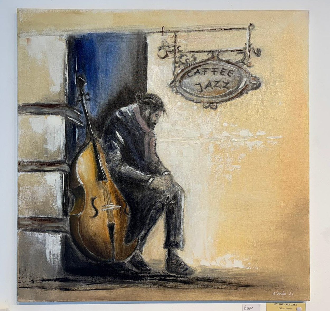 A soulful and atmospheric piece, “By the Jazz Café” captures a quiet, introspective moment of a musician resting with his double bass beside a cozy jazz café entrance. The expressive brushwork and muted, earthy tones draw the viewer into the melancholic stillness of the scene — a pause between songs, wrapped in memory and emotion.
