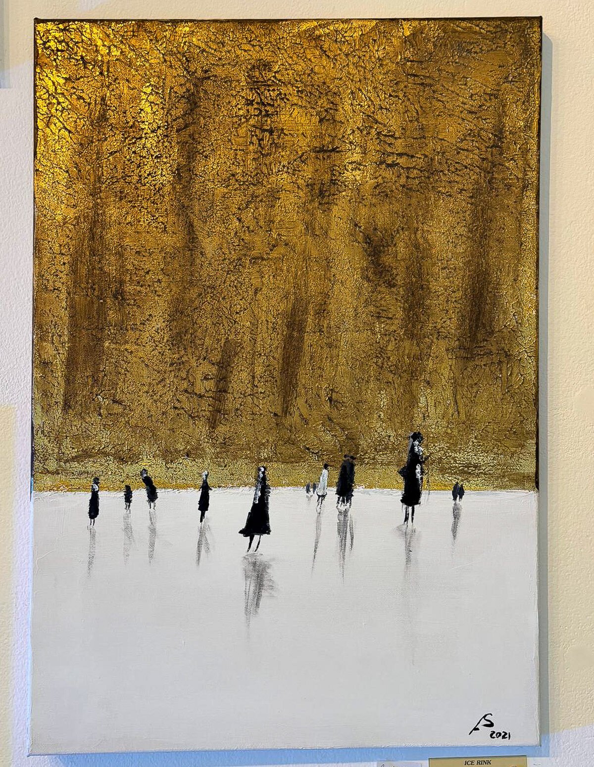 A captivating fusion of texture, abstraction, and minimalism — “Ice Rink” invites the viewer into a wintery dreamscape, where faceless figures glide across a white frozen surface beneath a glowing, golden backdrop. The textured metallic gold sky creates a striking contrast with the simplicity of the figures below, adding a sense of warmth, mystery, and surrealism.